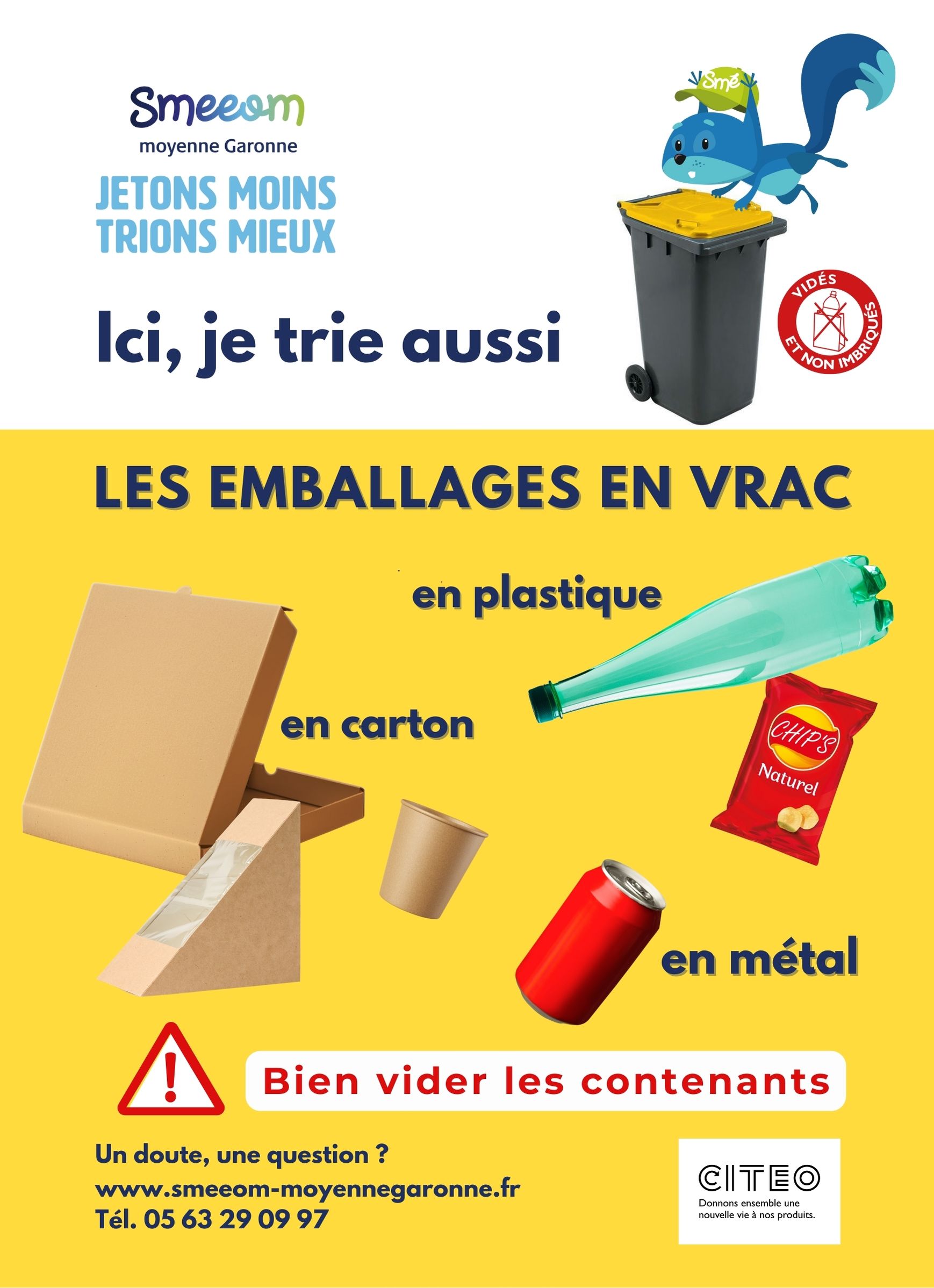 - des totems jaunes avec les consignes pour le tri des emballages recyclables et des conteneurs 120 litres jaunes ;